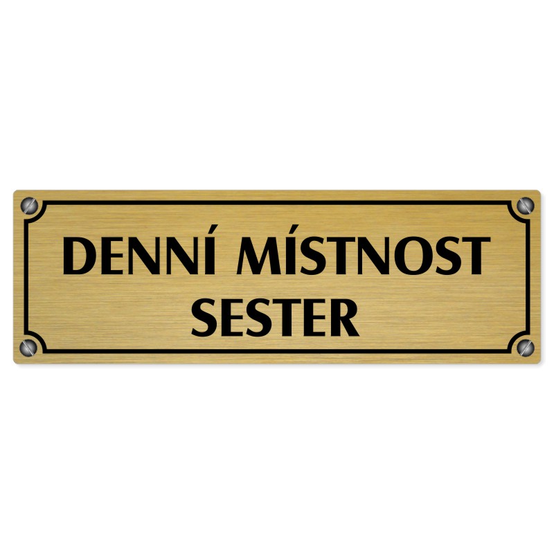 Denní místnost sester, 200x66mm, zlatá popiska s imitacemi šroubků