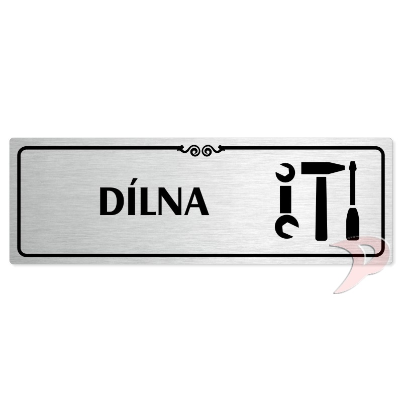 Dílna, 200x66mm, stříbrná popiska s ozdobou uprostřed