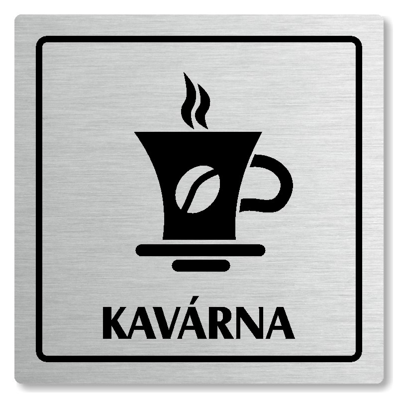 Cedulka na dveře “Kavárna“ Vyrobeno z broušeného lakovaného hliníku o síle 0,6 mm Rozměr je 80x80mm, 100x100mm, 118x118mm a 148x148mm Povrch je pololesklý  Obrázek či text je tepelně-chemicky natištěn do materiálu, a nelze ho odstranit. Cedulka je z výroby podlepena oboustrannou  páskou pro sna... celý popis