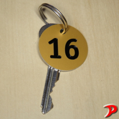 Hliníková klíčenka s eloxovaným povrchem a rytým číslem.