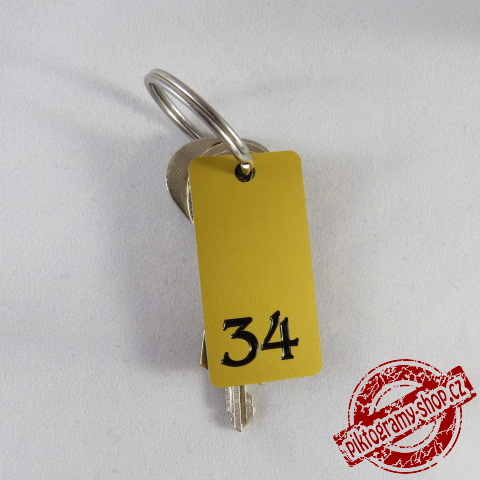 Hliníková klíčenka s eloxovaným povrchem a rytým číslem.