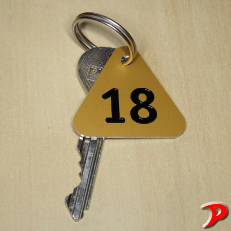 Hliníková klíčenka s eloxovaným povrchem a rytým číslem.