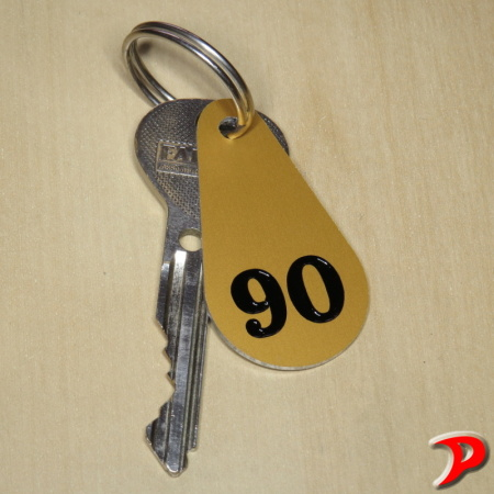 Hliníková klíčenka s eloxovaným povrchem a rytým číslem.