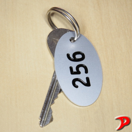 Hliníková klíčenka s eloxovaným povrchem a rytým číslem.