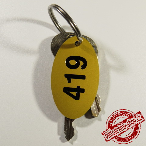 Hliníková klíčenka s eloxovaným povrchem a rytým číslem.