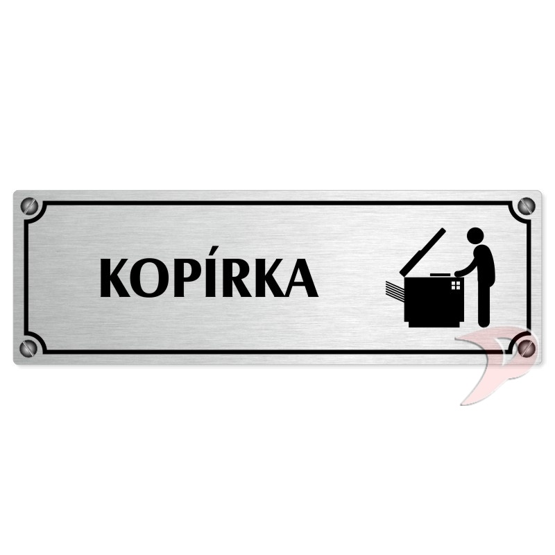 Popiska na dveře “Kopírka“ Vyrobeno z broušeného lakovaného hliníku o síle 0,6 mm Rozměr je 200x66mm a 240x79mm Povrch je pololesklý  Obrázek či text je tepelně-chemicky natištěn do materiálu, a nelze ho odstranit. Cedulka je z výroby podlepena oboustrannou  páskou pro snadnou montáž. Požadovan... celý popis