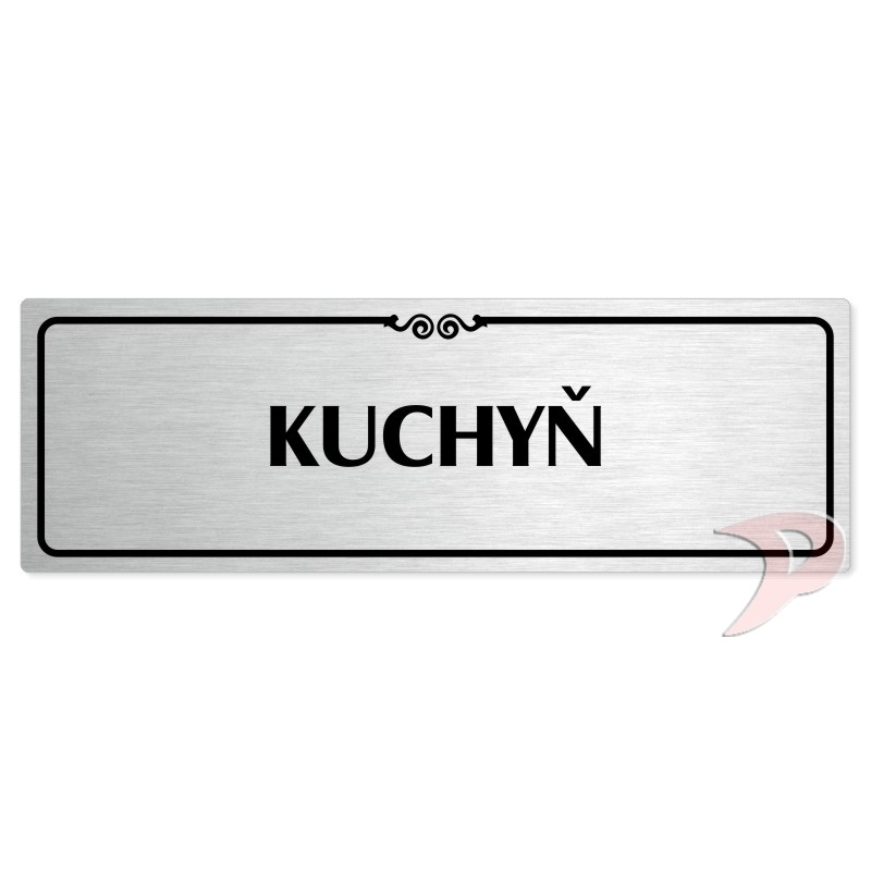 Kuchyň, 240x79mm, stříbrná popiska s ozdobou uprostřed