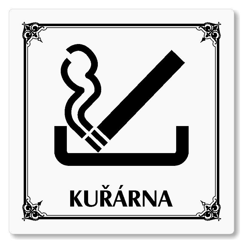 Cedulka na dveře “Kuřárna“ Vyrobeno z broušeného lakovaného hliníku o síle 0,6 mm Rozměr je 80x80mm, 100x100mm, 118x118mm a 148x148mm Povrch je pololesklý  Obrázek či text je tepelně-chemicky natištěn do materiálu, a nelze ho odstranit. Cedulka je z výroby podlepena oboustrannou  páskou pro sna... celý popis