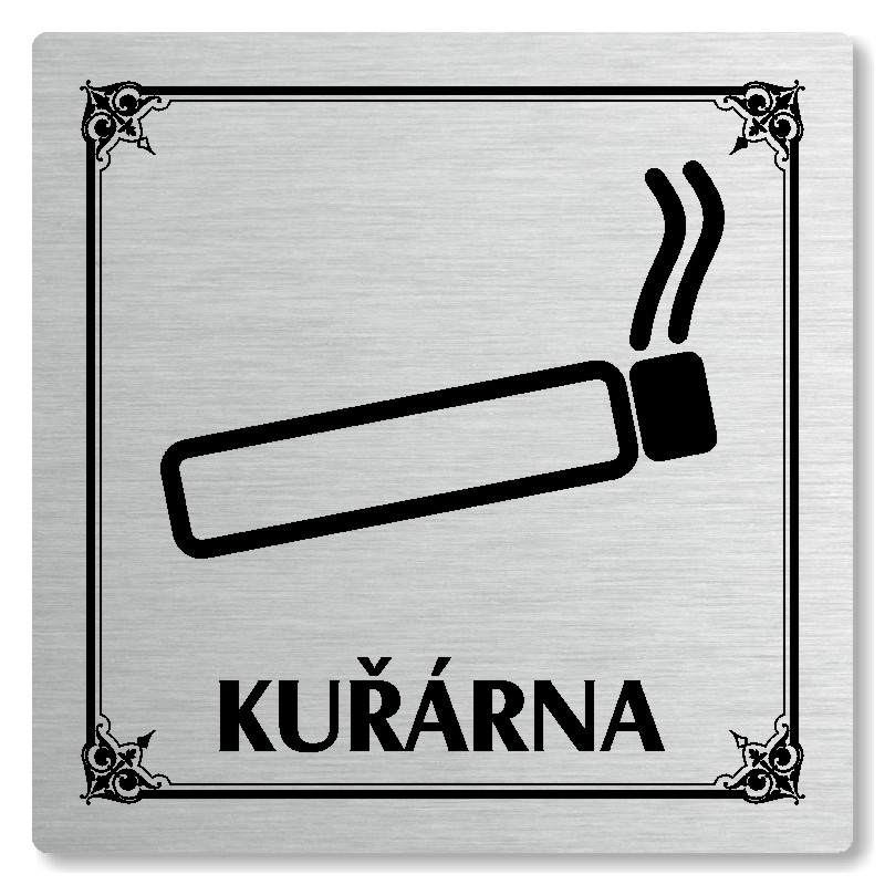 Cedulka na dveře “Kuřárna“ Vyrobeno z broušeného lakovaného hliníku o síle 0,6 mm Rozměr je 80x80mm, 100x100mm, 118x118mm a 148x148mm Povrch je pololesklý  Obrázek či text je tepelně-chemicky natištěn do materiálu, a nelze ho odstranit. Cedulka je z výroby podlepena oboustrannou  páskou pro sna... celý popis