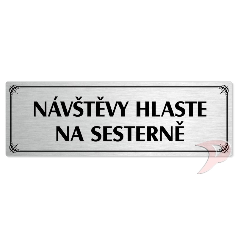 Návštěvy hlaste, 200x66mm, stříbrná popiska s okrasným rámečkem