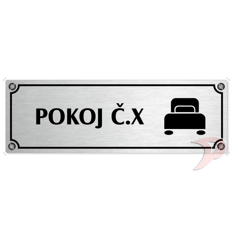 Pokoj č., 200x66mm, stříbrná popiska s imitacemi šroubků