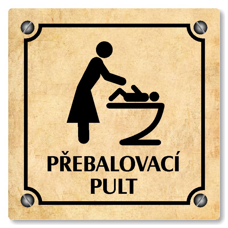 Cedulka na dveře “Přebalovací pult“ Vyrobeno z broušeného lakovaného hliníku o síle 0,6 mm Rozměr je 80x80mm, 100x100mm, 118x118mm a 148x148mm Povrch je pololesklý  Obrázek či text je tepelně-chemicky natištěn do materiálu, a nelze ho odstranit. Cedulka je z výroby podlepena oboustrannou  pásko... celý popis