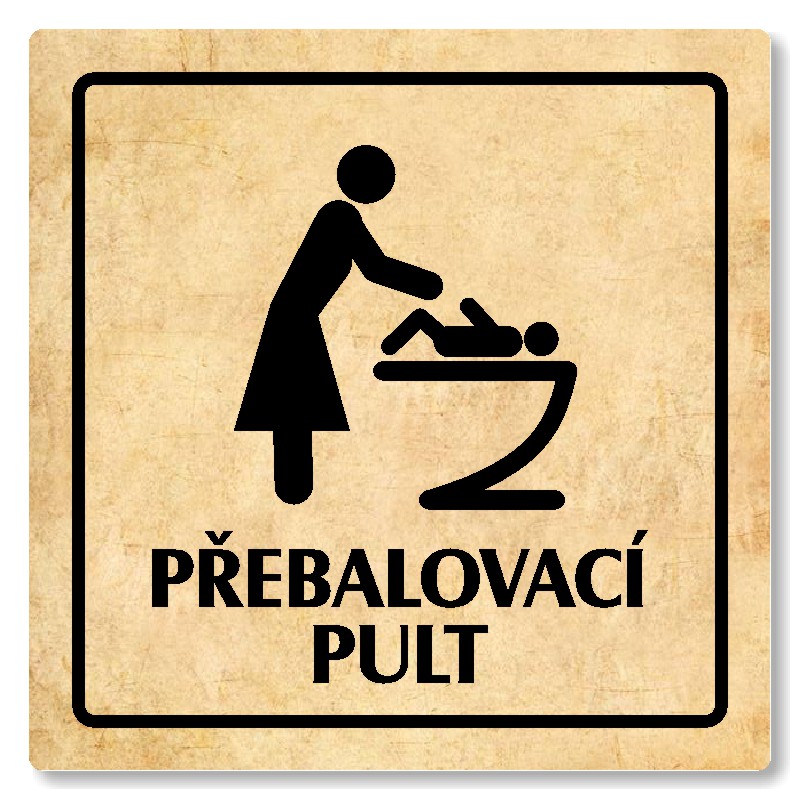 Cedulka na dveře “Přebalovací pult“ Vyrobeno z broušeného lakovaného hliníku o síle 0,6 mm Rozměr je 80x80mm, 100x100mm, 118x118mm a 148x148mm Povrch je pololesklý  Obrázek či text je tepelně-chemicky natištěn do materiálu, a nelze ho odstranit. Cedulka je z výroby podlepena oboustrannou  pásko... celý popis
