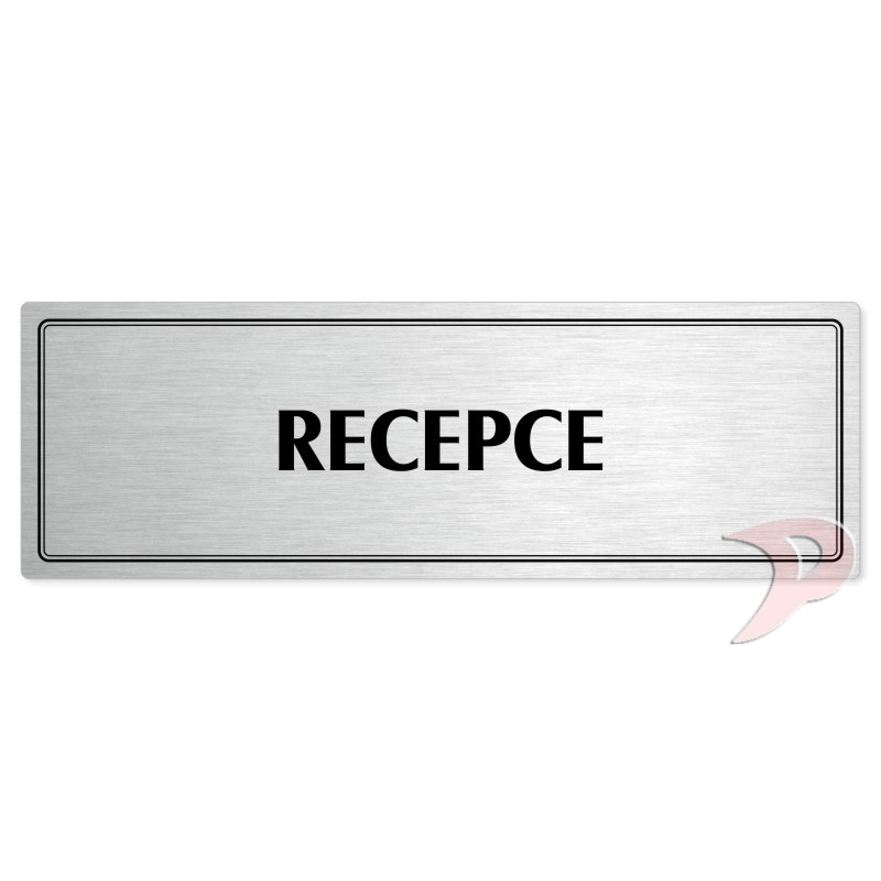 Popiska na dveře “Recepce“ Vyrobeno z broušeného lakovaného hliníku o síle 0,6 mm Rozměr je 200x66mm a 240x79mm Povrch je pololesklý  Obrázek či text je tepelně-chemicky natištěn do materiálu, a nelze ho odstranit. Cedulka je z výroby podlepena oboustrannou  páskou pro snadnou montáž. Požadovan... celý popis