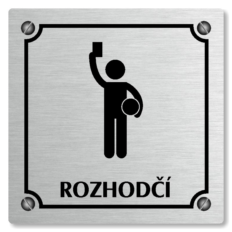 Cedulka na dveře “Rozhodčí“ Vyrobeno z broušeného lakovaného hliníku o síle 0,6 mm Rozměr je 80x80mm, 100x100mm, 118x118mm a 148x148mm Povrch je pololesklý  Obrázek či text je tepelně-chemicky natištěn do materiálu, a nelze ho odstranit. Cedulka je z výroby podlepena oboustrannou  páskou pro sn... celý popis