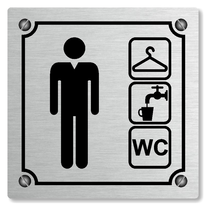 Cedulka na dveře “Šatna muži, wc“ Vyrobeno z broušeného lakovaného hliníku o síle 0,6 mm Rozměr je 80x80mm, 100x100mm, 118x118mm a 148x148mm Povrch je pololesklý  Obrázek či text je tepelně-chemicky natištěn do materiálu, a nelze ho odstranit. Cedulka je z výroby podlepena oboustrannou  páskou ... celý popis