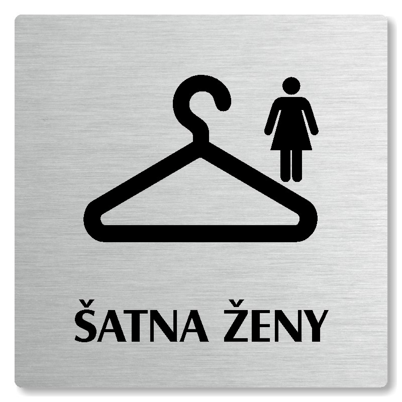 Cedulka na dveře “Šatna ženy“ Vyrobeno z broušeného lakovaného hliníku o síle 0,6 mm Rozměr je 80x80mm, 100x100mm, 118x118mm a 148x148mm Povrch je pololesklý  Obrázek či text je tepelně-chemicky natištěn do materiálu, a nelze ho odstranit. Cedulka je z výroby podlepena oboustrannou  páskou pro ... celý popis