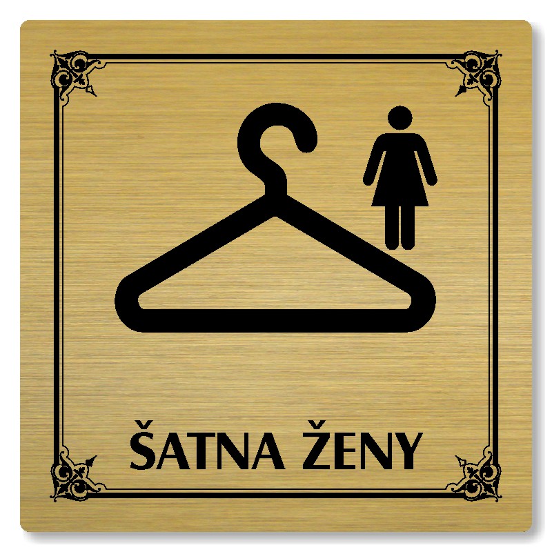 Cedulka na dveře “Šatna ženy“ Vyrobeno z broušeného lakovaného hliníku o síle 0,6 mm Rozměr je 80x80mm, 100x100mm, 118x118mm a 148x148mm Povrch je pololesklý  Obrázek či text je tepelně-chemicky natištěn do materiálu, a nelze ho odstranit. Cedulka je z výroby podlepena oboustrannou  páskou pro ... celý popis