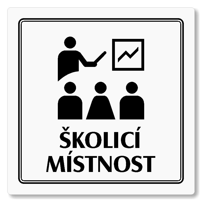 Cedulka na dveře “Školicí místnost“ Vyrobeno z broušeného lakovaného hliníku o síle 0,6 mm Rozměr je 80x80mm, 100x100mm, 118x118mm a 148x148mm Povrch je pololesklý  Obrázek či text je tepelně-chemicky natištěn do materiálu, a nelze ho odstranit. Cedulka je z výroby podlepena oboustrannou  pásko... celý popis