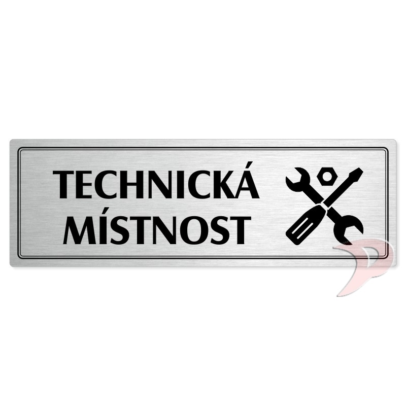 Popiska na dveře “Technická místnost“ Vyrobeno z broušeného lakovaného hliníku o síle 0,6 mm Rozměr je 200x66mm a 240x79mm Povrch je pololesklý  Obrázek či text je tepelně-chemicky natištěn do materiálu, a nelze ho odstranit. Cedulka je z výroby podlepena oboustrannou  páskou pro snadnou montáž... celý popis