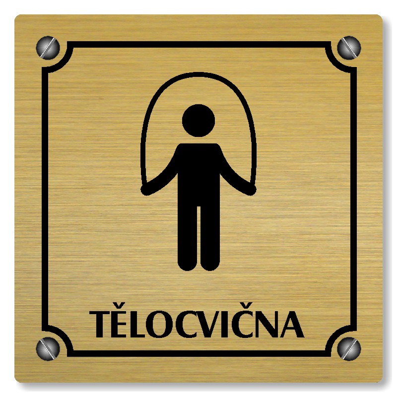 Cedulka na dveře “Tělocvična“ Vyrobeno z broušeného lakovaného hliníku o síle 0,6 mm Rozměr je 80x80mm, 100x100mm, 118x118mm a 148x148mm Povrch je pololesklý  Obrázek či text je tepelně-chemicky natištěn do materiálu, a nelze ho odstranit. Cedulka je z výroby podlepena oboustrannou  páskou pro ... celý popis