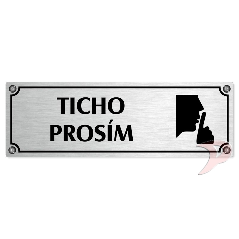 Ticho prosím, 200x66mm, stříbrná popiska s imitacemi šroubků