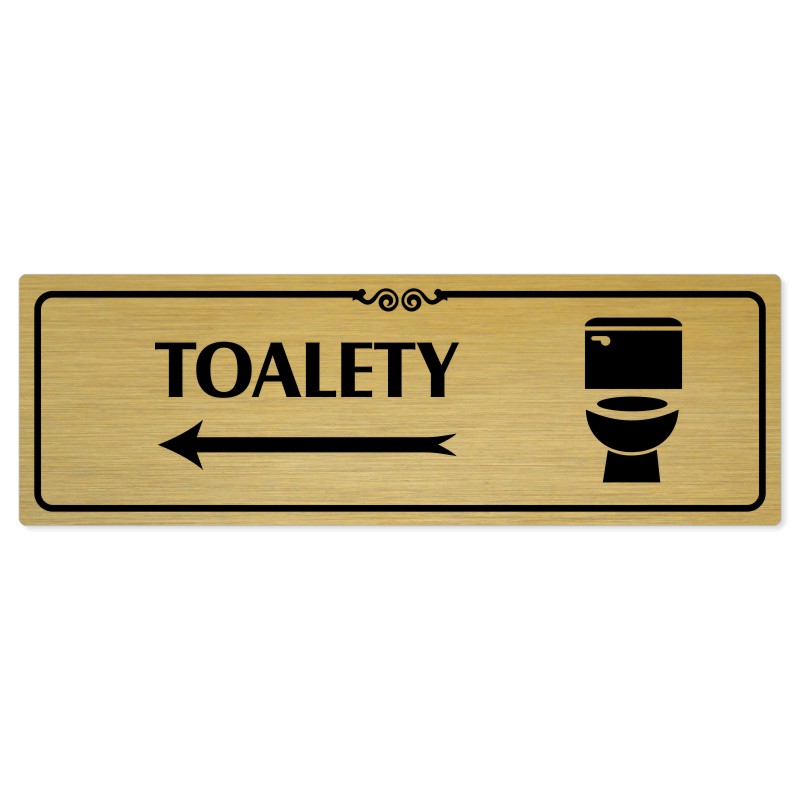 Toalety vlevo, 200x66mm, zlatá popiska s ozdobou uprostřed