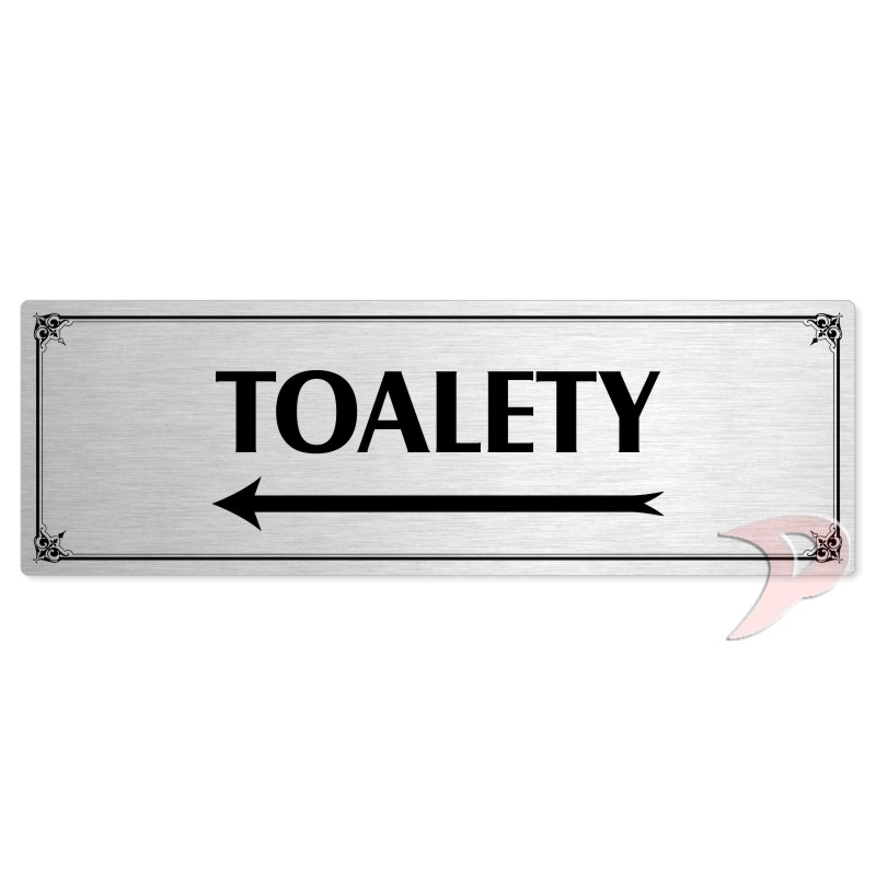 Toalety vlevo, 240x79mm, stříbrná popiska s okrasným rámečkem