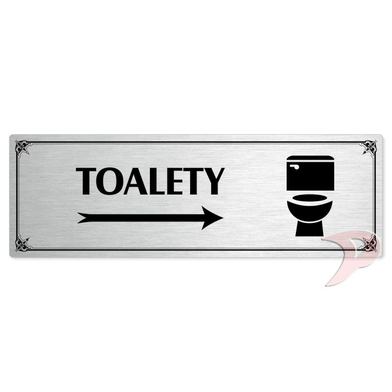 Toalety vpravo, 240x79mm, stříbrná popiska s okrasným rámečkem