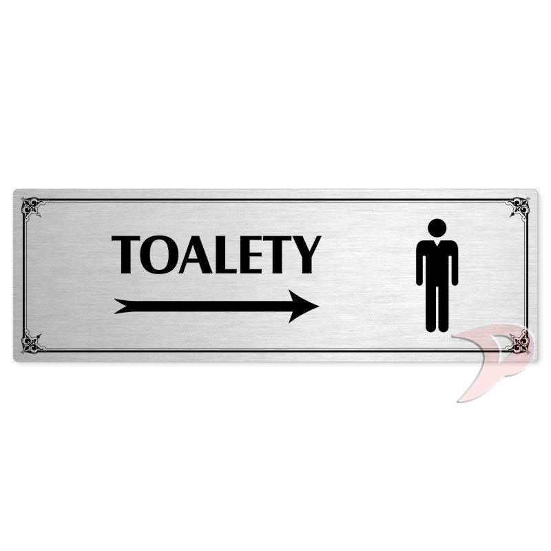 Toalety vpravo muži, 200x66mm, stříbrná popiska s okrasným rámečkem