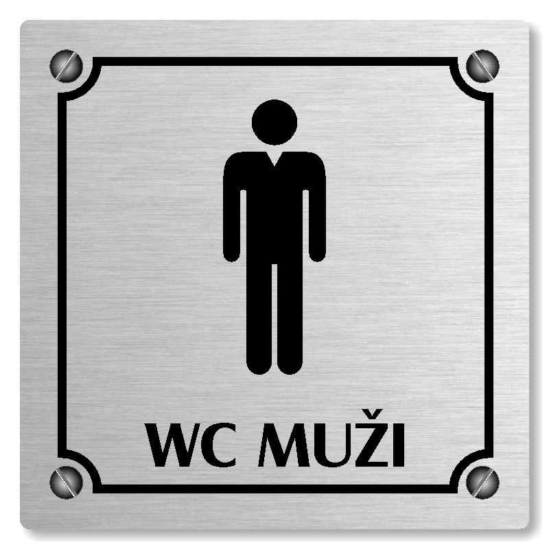 Cedulka na dveře “WC muži“ Vyrobeno z broušeného lakovaného hliníku o síle 0,6 mm Rozměr je 80x80mm, 100x100mm, 118x118mm a 148x148mm Povrch je pololesklý  Obrázek či text je tepelně-chemicky natištěn do materiálu, a nelze ho odstranit. Cedulka je z výroby podlepena oboustrannou  páskou pro sna... celý popis