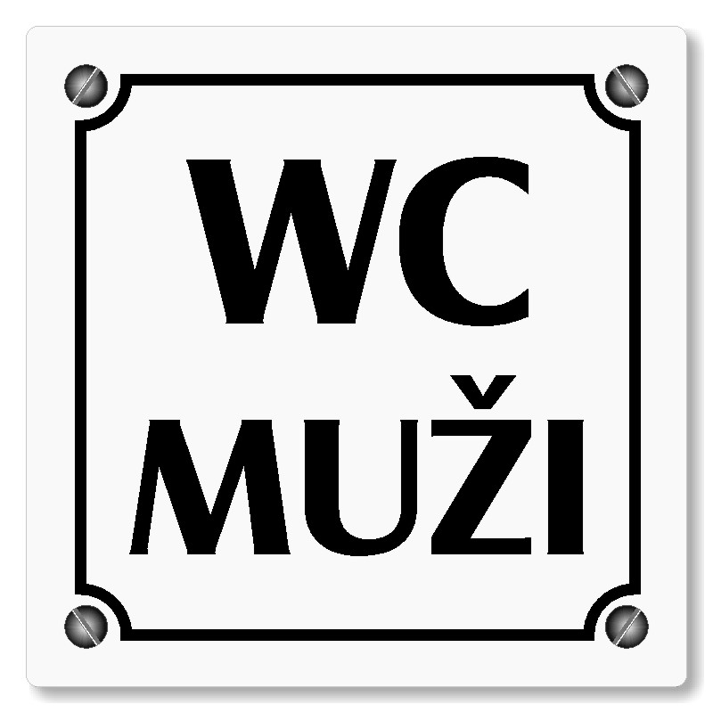 Cedulka na dveře “WC muži“ Vyrobeno z broušeného lakovaného hliníku o síle 0,6 mm Rozměr je 80x80mm, 100x100mm, 118x118mm a 148x148mm Povrch je pololesklý  Obrázek či text je tepelně-chemicky natištěn do materiálu, a nelze ho odstranit. Cedulka je z výroby podlepena oboustrannou  páskou pro sna... celý popis