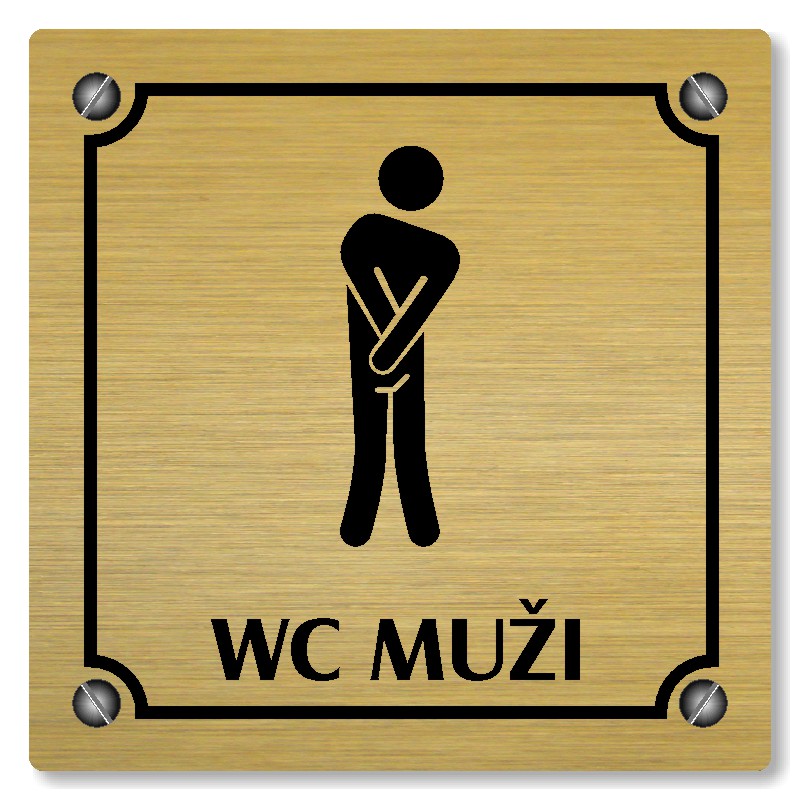 Cedulka na dveře “WC muži“ Vyrobeno z broušeného lakovaného hliníku o síle 0,6 mm Rozměr je 80x80mm, 100x100mm, 118x118mm a 148x148mm Povrch je pololesklý  Obrázek či text je tepelně-chemicky natištěn do materiálu, a nelze ho odstranit. Cedulka je z výroby podlepena oboustrannou  páskou pro sna... celý popis