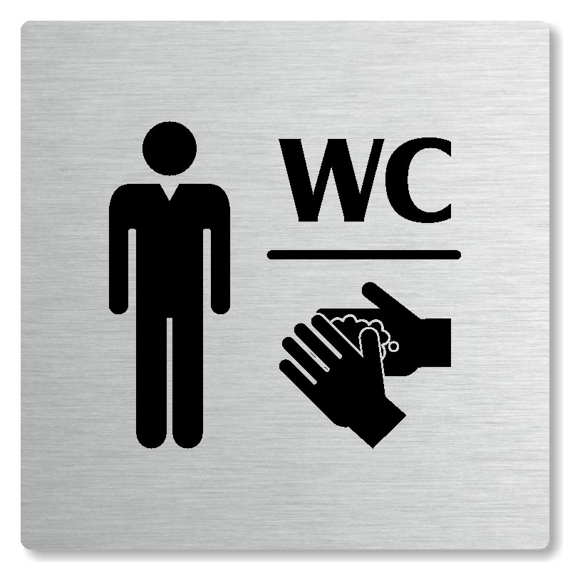 Cedulka na dveře “WC muži“ Vyrobeno z broušeného lakovaného hliníku o síle 0,6 mm Rozměr je 80x80mm, 100x100mm, 118x118mm a 148x148mm Povrch je pololesklý  Obrázek či text je tepelně-chemicky natištěn do materiálu, a nelze ho odstranit. Cedulka je z výroby podlepena oboustrannou  páskou pro sna... celý popis