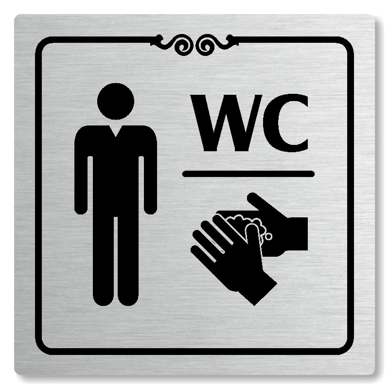 Cedulka na dveře “WC muži“ Vyrobeno z broušeného lakovaného hliníku o síle 0,6 mm Rozměr je 80x80mm, 100x100mm, 118x118mm a 148x148mm Povrch je pololesklý  Obrázek či text je tepelně-chemicky natištěn do materiálu, a nelze ho odstranit. Cedulka je z výroby podlepena oboustrannou  páskou pro sna... celý popis