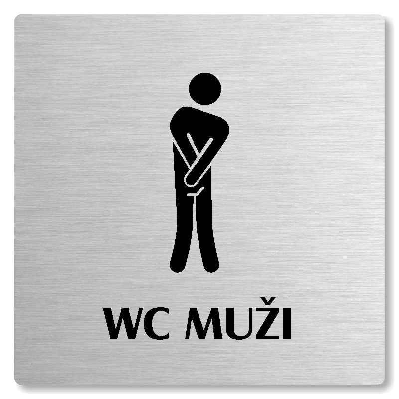 Cedulka na dveře “WC muži“ Vyrobeno z broušeného lakovaného hliníku o síle 0,6 mm Rozměr je 80x80mm, 100x100mm, 118x118mm a 148x148mm Povrch je pololesklý  Obrázek či text je tepelně-chemicky natištěn do materiálu, a nelze ho odstranit. Cedulka je z výroby podlepena oboustrannou  páskou pro sna... celý popis