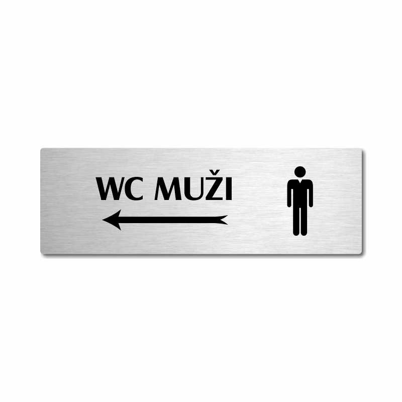 Popiska na dveře “WC muži vlevo“ Vyrobeno z broušeného lakovaného hliníku o síle 0,6 mm Rozměr je 200x66mm a 240x79mm Povrch je pololesklý  Obrázek či text je tepelně-chemicky natištěn do materiálu, a nelze ho odstranit. Cedulka je z výroby podlepena oboustrannou  páskou pro snadnou montáž. Pož... celý popis