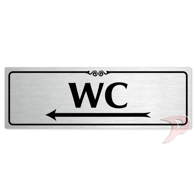 WC vlevo, 200x66mm, stříbrná popiska s ozdobou uprostřed