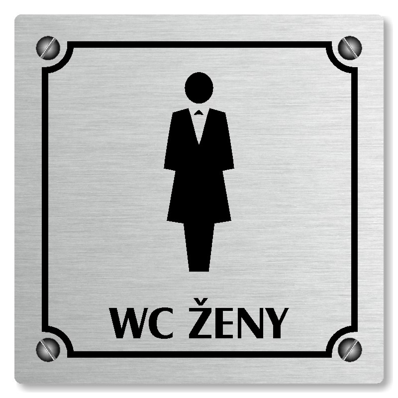 Cedulka na dveře “WC ženy“ Vyrobeno z broušeného lakovaného hliníku o síle 0,6 mm Rozměr je 80x80mm, 100x100mm, 118x118mm a 148x148mm Povrch je pololesklý  Obrázek či text je tepelně-chemicky natištěn do materiálu, a nelze ho odstranit. Cedulka je z výroby podlepena oboustrannou  páskou pro sna... celý popis