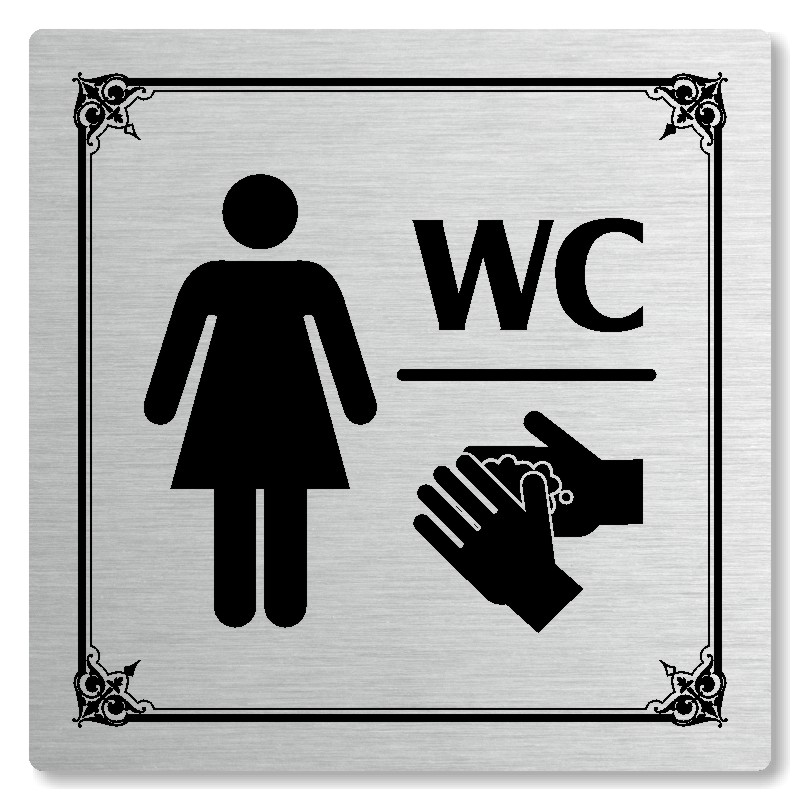 Cedulka na dveře “WC ženy“ Vyrobeno z broušeného lakovaného hliníku o síle 0,6 mm Rozměr je 80x80mm, 100x100mm, 118x118mm a 148x148mm Povrch je pololesklý  Obrázek či text je tepelně-chemicky natištěn do materiálu, a nelze ho odstranit. Cedulka je z výroby podlepena oboustrannou  páskou pro sna... celý popis